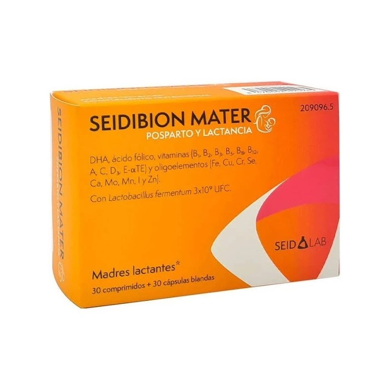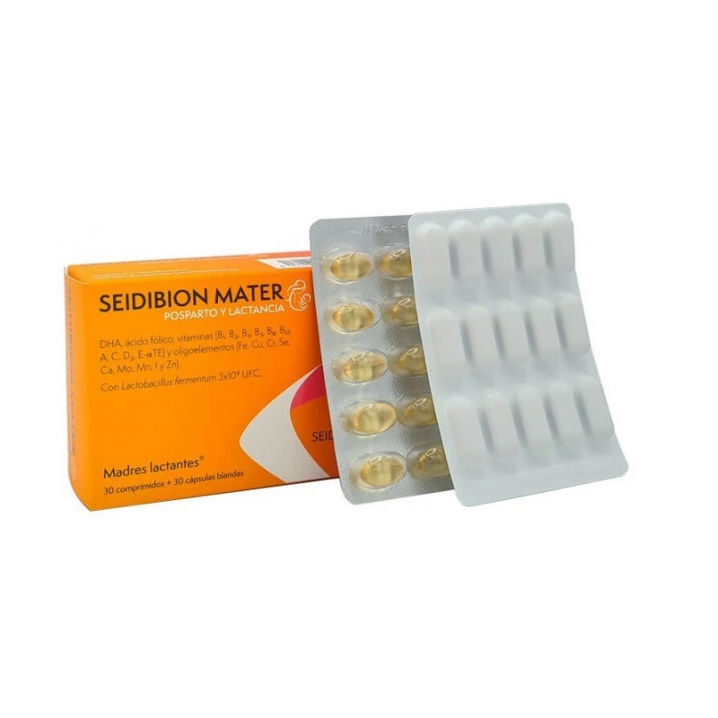 Seidibion Mater es un complemento alimenticio completo que combina 30 comprimidos y 30 cápsulas blandas, diseñado para cubrir las necesidades nutricionales de las mujeres que están buscando embarazo, embarazadas o en periodo de lactancia.