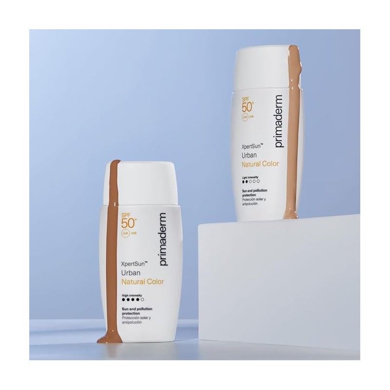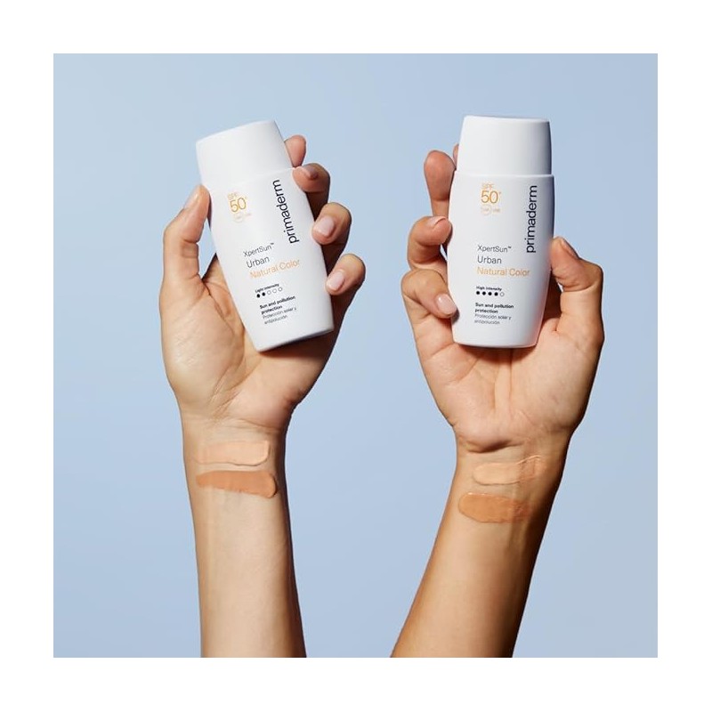 Fotoprotector urbano con color natural ligero y SPF50+, que protege frente al sol, la polución y la luz azul mientras unifica el tono de la piel.
