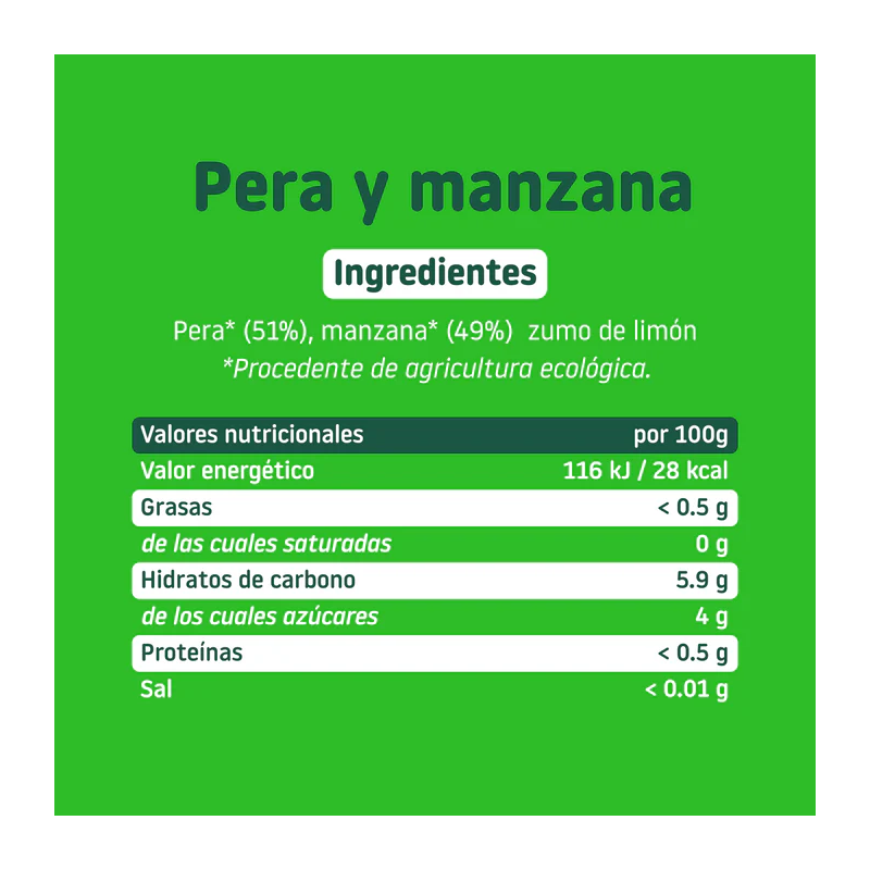 Pera* (51%), manzana* (49%) y zumo de limón*. *Procedente de agricultura ecológica.