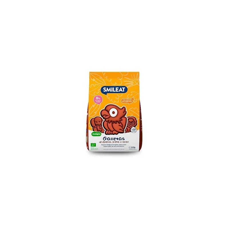 Smileat Galletas de Espelta, Avena y Cacao Eco 220 g son galletas infantiles ecológicas, elaboradas con ingredientes naturales y seleccionados, sin azúcares añadidos, ideales para acompañar meriendas y desayunos saludables.