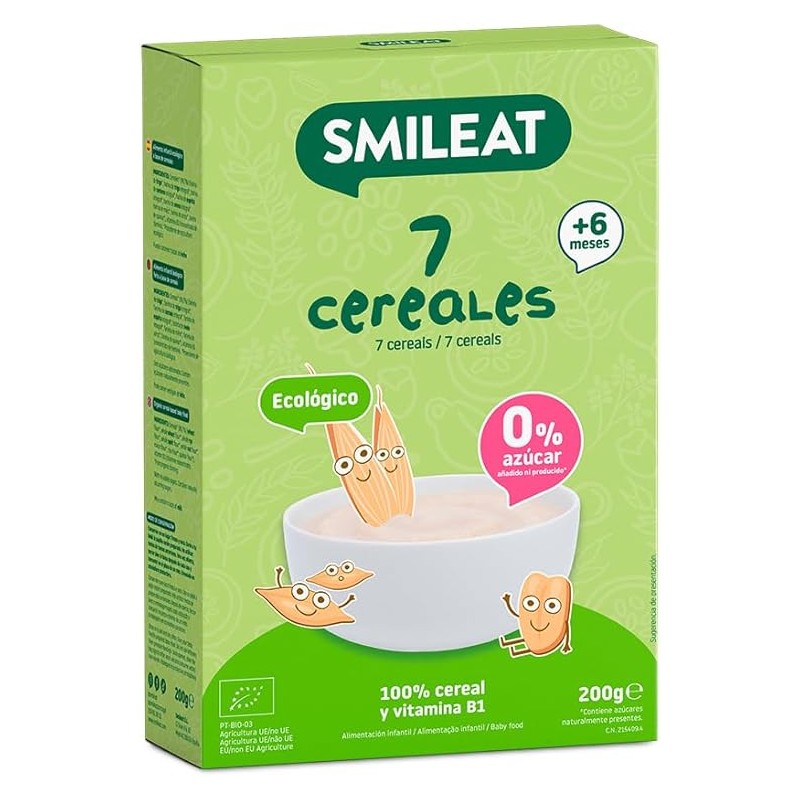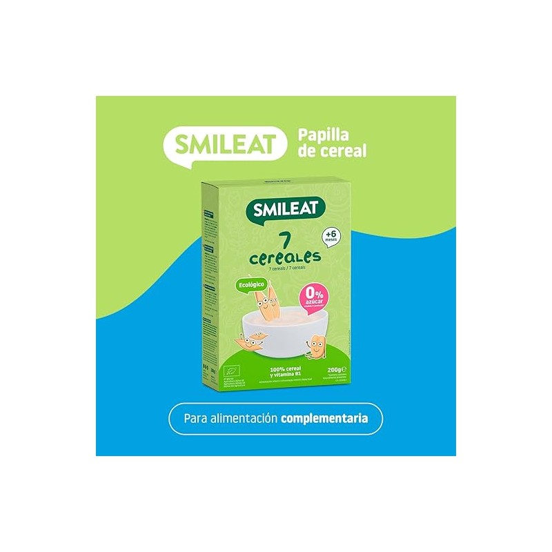 Smileat Papilla 7 Cereales Ecológica está elaborada con una mezcla de trigo, arroz, maíz, cebada, avena, centeno y mijo, todos ellos procedentes de agricultura ecológica. Gracias a su variedad de cereales integrales, aporta energía, fibra y nutrientes esenciales para favorecer el desarrollo y bienestar de los más pequeños.