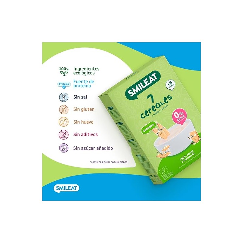 No contiene azúcares añadidos, aceite de palma, conservantes, colorantes ni aromas artificiales, respetando al máximo la filosofía de alimentación saludable y natural de Smileat. Su textura suave y su sabor auténtico la convierten en una excelente opción para introducir los cereales en la dieta del bebé a partir de los 6 meses, siempre bajo recomendación del pediatra.