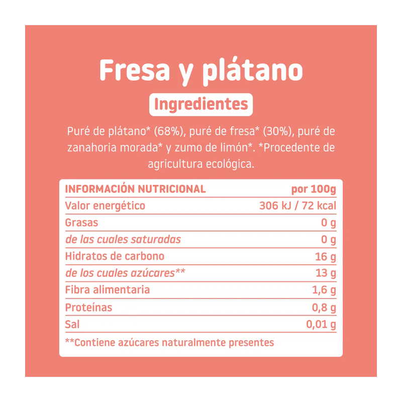 Puré de plátano* (68%), puré de fresa* (30%), puré de zanahoria morada* y zumo de limón*. *Procedente de agricultura ecológica.