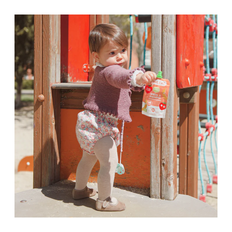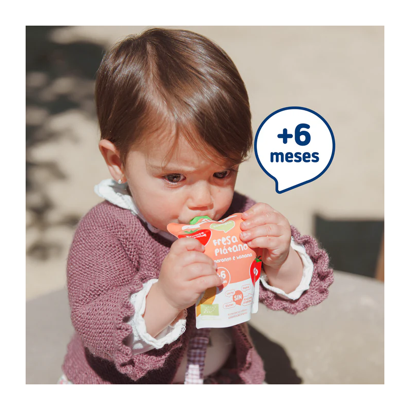 Snack pouch líquido con ingredientes 100% ecológico de fresa y plátano. Listo para llevar y tomar en cualquier lugar.