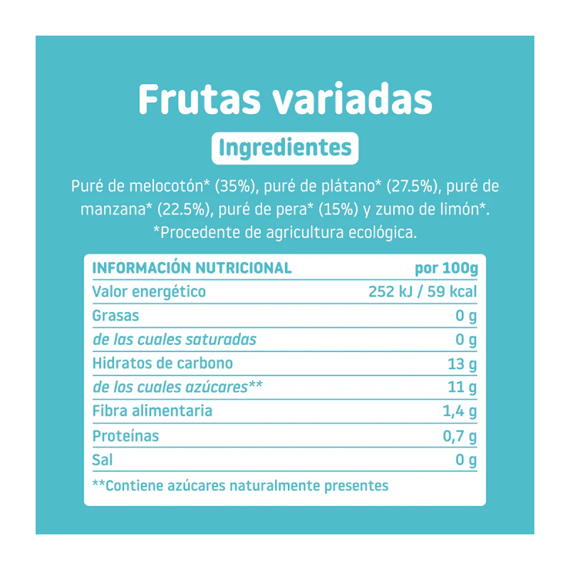 Snack pouch líquido con ingredientes 100% ecológico de frutas variadas. Listo para llevar y tomar en cualquier lugar.