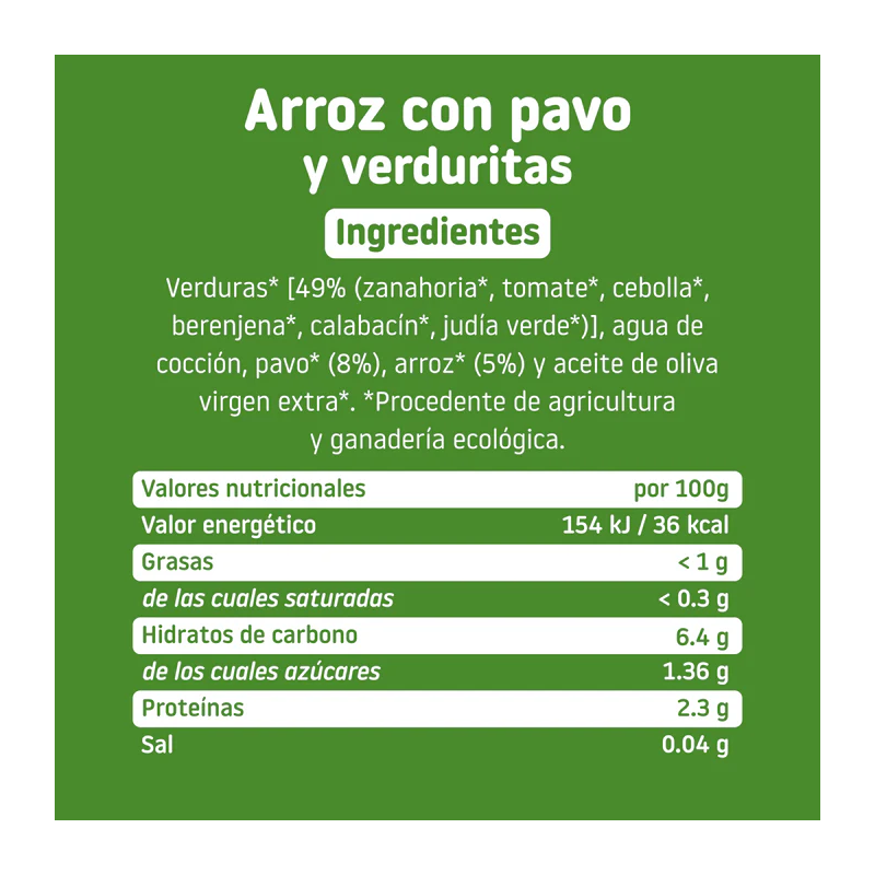 Verduras* [49% (zanahoria*, tomate*, cebolla*, berenjena*, calabacín*, judía verde*)], agua de cocción, pavo* (8%), arroz* (6.5%) y aceite de oliva virgen extra*. *Procedente de agricultura y ganadería ecológica.
