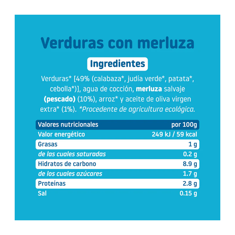 Verduras* [65.2% (calabaza*, judía verde*, patata*, cebolla*)], agua de cocción, merluza salvaje (10%), arroz* y aceite de oliva virgen extra* (1%). *Procedente de agricultura ecológica.