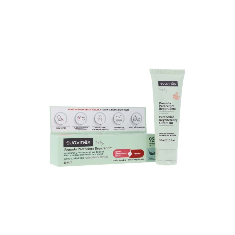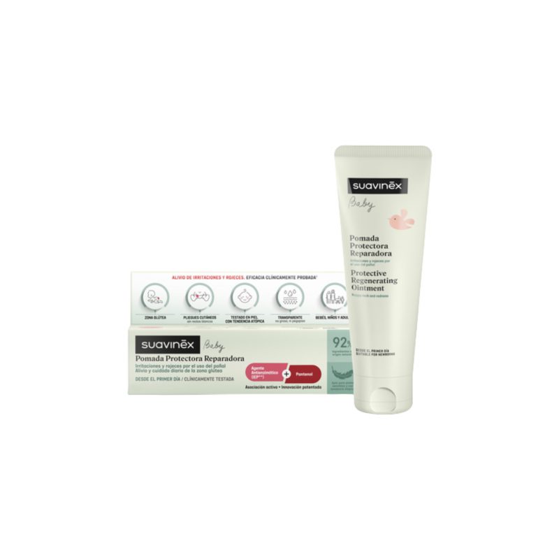 Suavinex Baby Pomada Protectora Reparadora 50 ml está especialmente formulada para proteger y reparar la delicada piel del bebé en la zona del pañal. Su fórmula avanzada combina un agente enzimático (IEP**), que ayuda a neutralizar los efectos irritantes de las enzimas presentes en la orina y las heces, con pantenol, conocido por sus propiedades calmantes y regeneradoras.