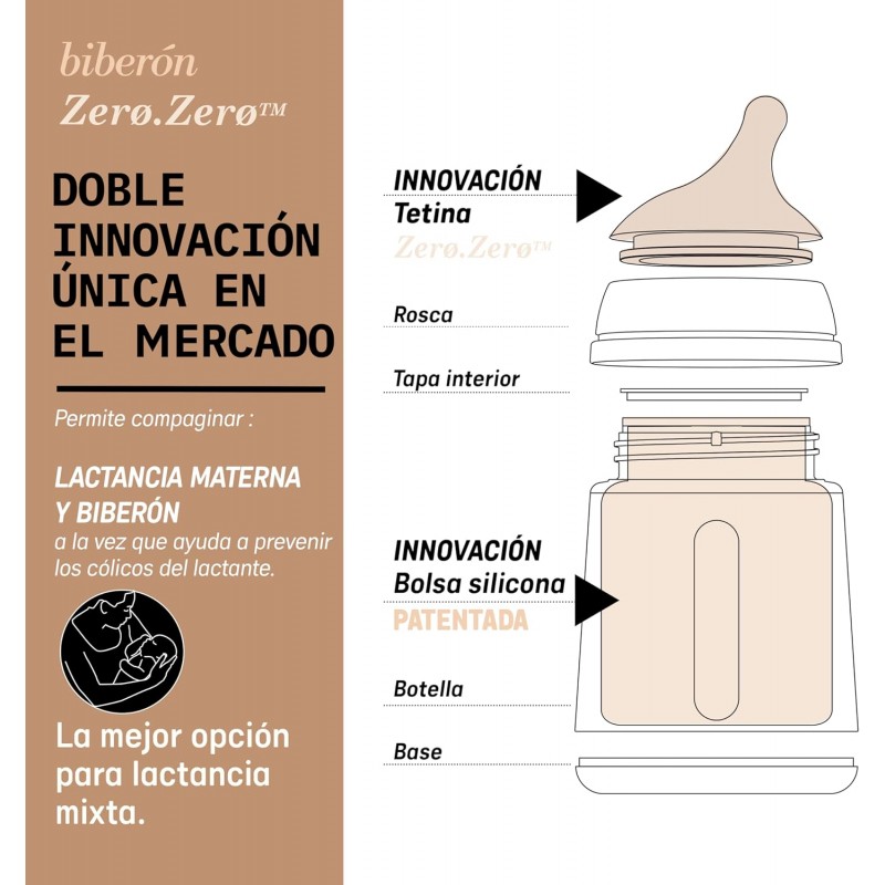 Biberón Zero Zero anticólico con flujo adaptable, diseñado para imitar el pezón del pecho materno y facilitar la lactancia mixta desde el nacimiento.