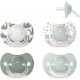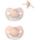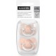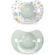 Chupete fisiológico de silicona para bebés de 6 a 18 meses, con tetina simétrica, plana y diseñada para respetar la cavidad oral y ofrecer la misma sensación natural que el bebé experimenta sin chupete. Pack con 2 unidades.