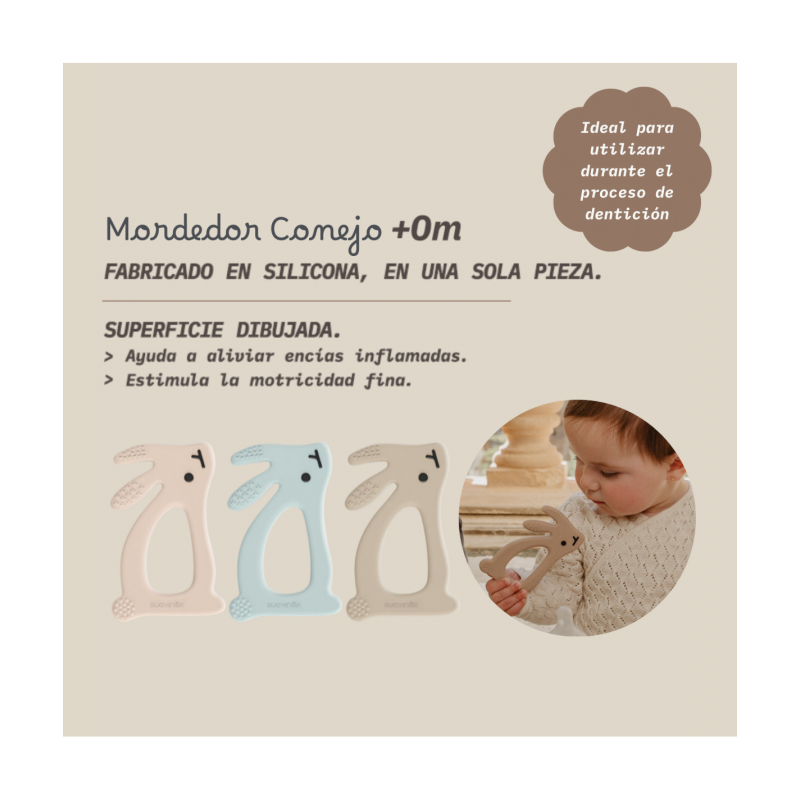 El Suavinex Mordedor Conejito +0 Meses está pensado para acompañar a los bebés en las etapas iniciales de la dentición, ofreciendo un alivio eficaz y seguro. Su diseño atractivo en forma de conejito y su tamaño adaptado permiten que el pequeño lo agarre fácilmente. Fabricado con materiales de alta calidad, libres de BPA y sustancias nocivas, garantiza la máxima seguridad durante su uso. Además, su textura suave proporciona un masaje delicado que ayuda a calmar las encías inflamadas y fomenta el desarrollo sensorial oral del bebé