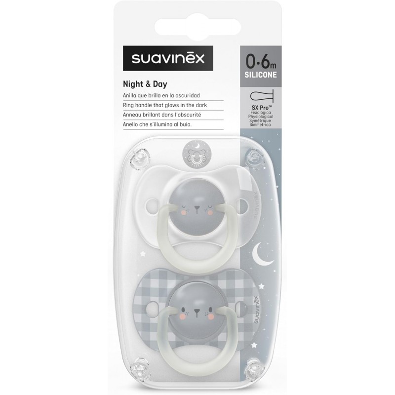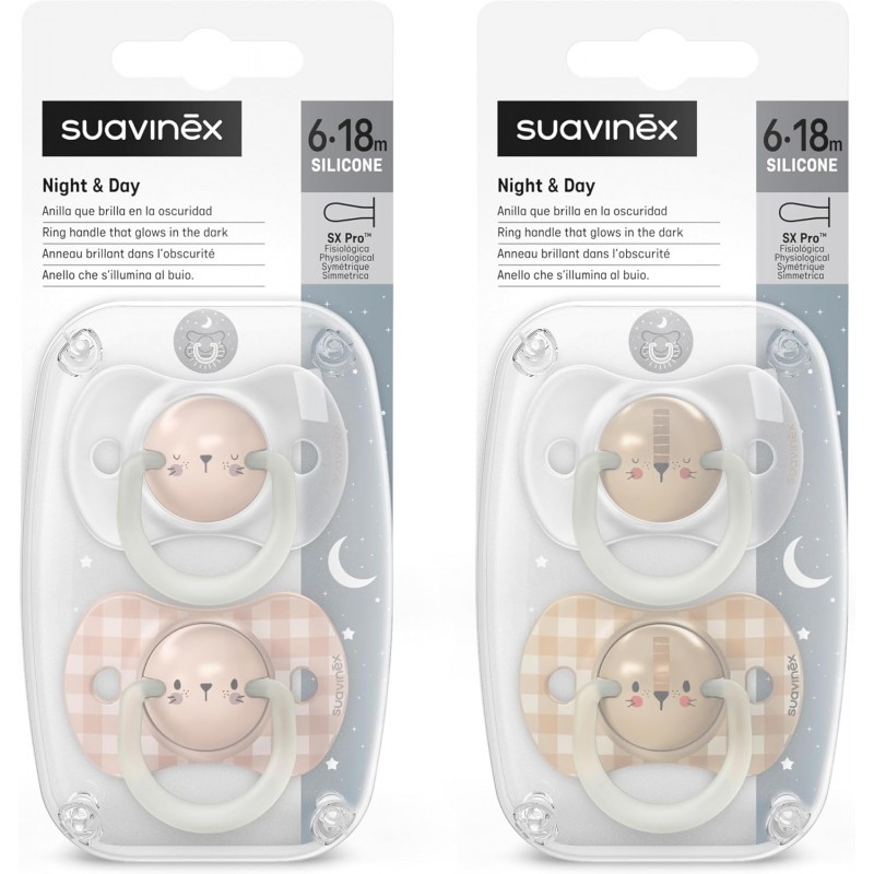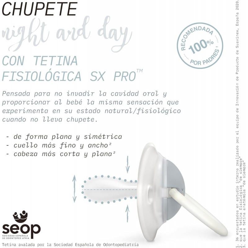 Más informaciónEl Chupete SX Pro Night & Day de Suavinex está especialmente diseñado para acompañar al bebé en todas las etapas del descanso, gracias a su tetina fisiológica de silicona ultra suave que imita la forma del pezón materno durante la succión y además se ilumina y brilla en la oscuridad.