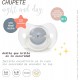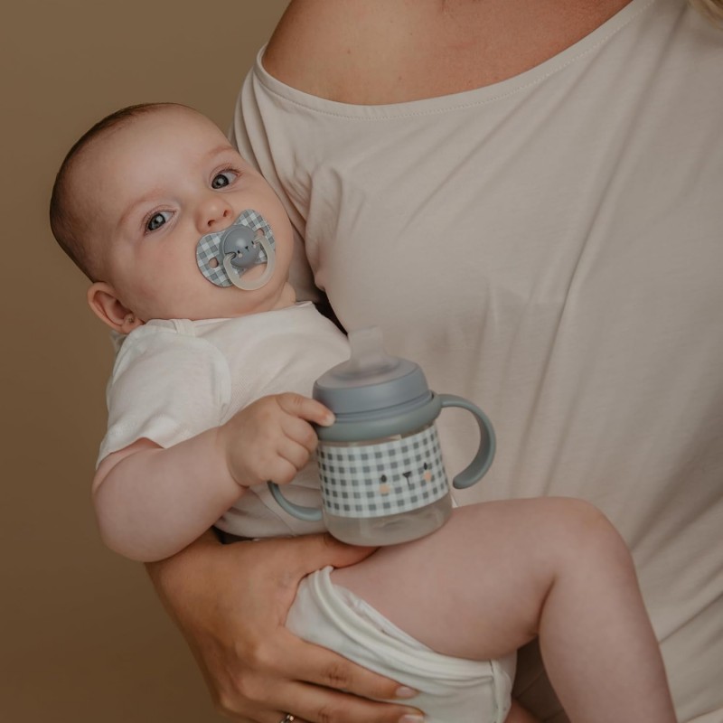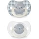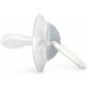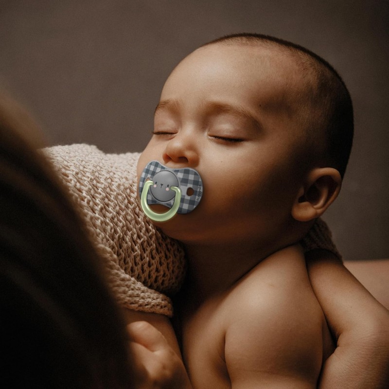 Su forma plana y simétrica permite un desarrollo bucodental natural, mientras que el escudo ligero y ventilado evita roces e irritaciones en la piel. Además, incorpora detalles que brillan en la oscuridad, facilitando su localización durante la noche sin despertar al bebé.