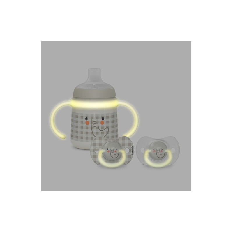 Vaso de aprendizaje antiderrame y anticólico con asas, tetina blanda de silicona antiderrame y un diseño exclusivo que se ilumina y brilla en la oscuridad. Diseñado para bebés a partir de 6 meses que se inician en la autonomía y transición a realizar las tomas por sí mismos.