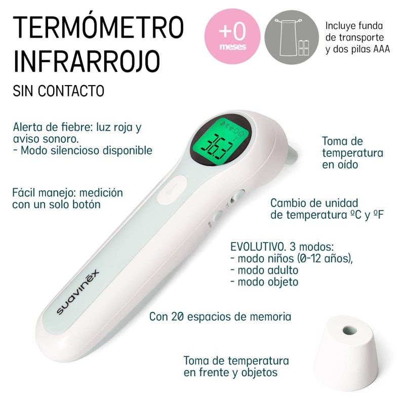 Más informaciónEl termómetro digital sin contacto de Suavinex es la solución ideal para medir la temperatura de bebés, niños y adultos de forma rápida, segura y sin molestias. Gracias a su tecnología de infrarrojos, permite realizar mediciones tanto en la frente como en el oído, evitando el contacto directo con la piel.