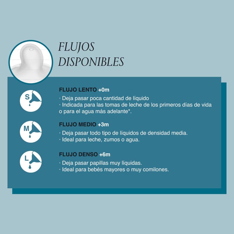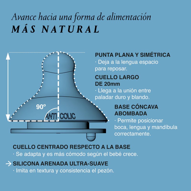 Tetina de silicona fisiológica de flujo medio para niños mayores de 0 meses. Sistema anticólico.