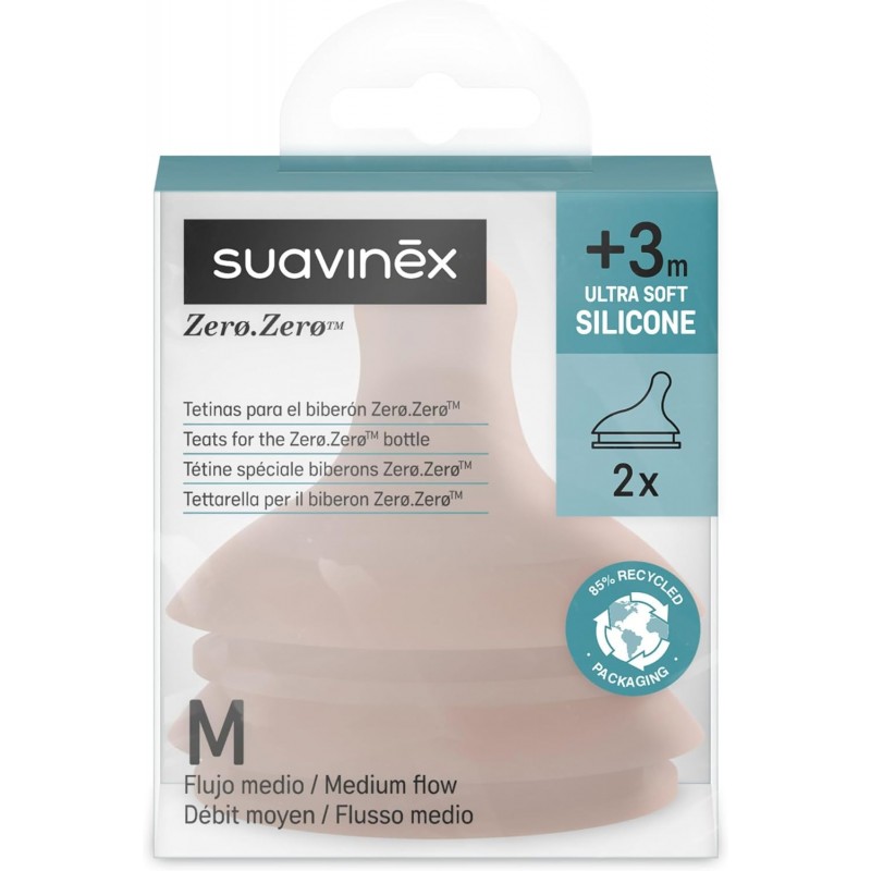 Pack de 2 tetinas para biberón Suavinex Zero Zero de la talla M, para flujo medio, para dar a tu bebé agua, leche, zumos y papilla.