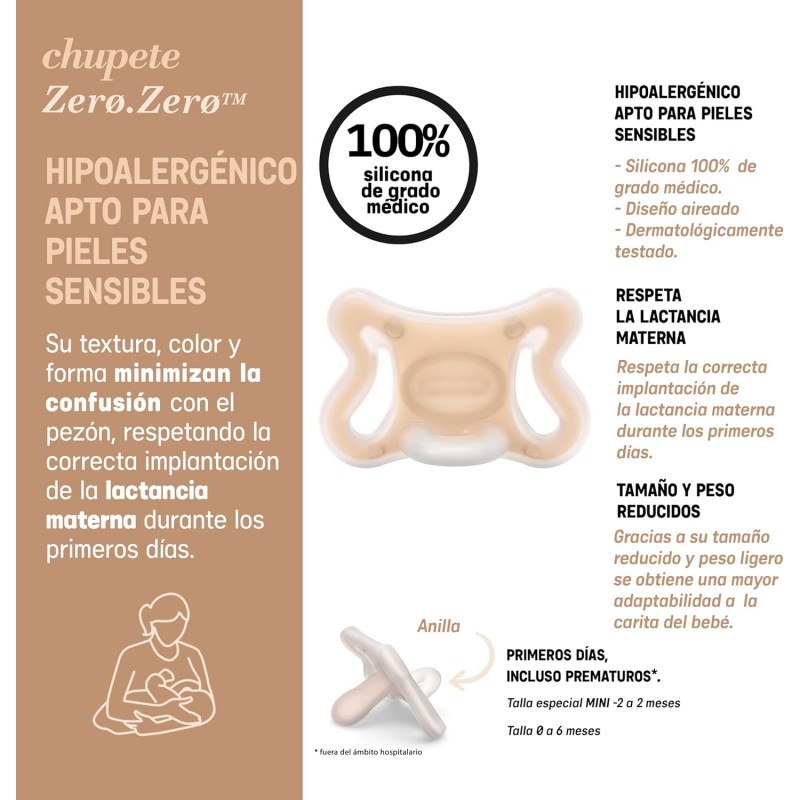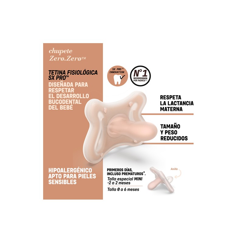 Chupete de silicona Suavinex Zero Zero con boquilla fisiológica SX Pro, indicado para bebés de 0 a 6 meses, diseñado para respetar el desarrollo oral y ofrecer máximo confort.