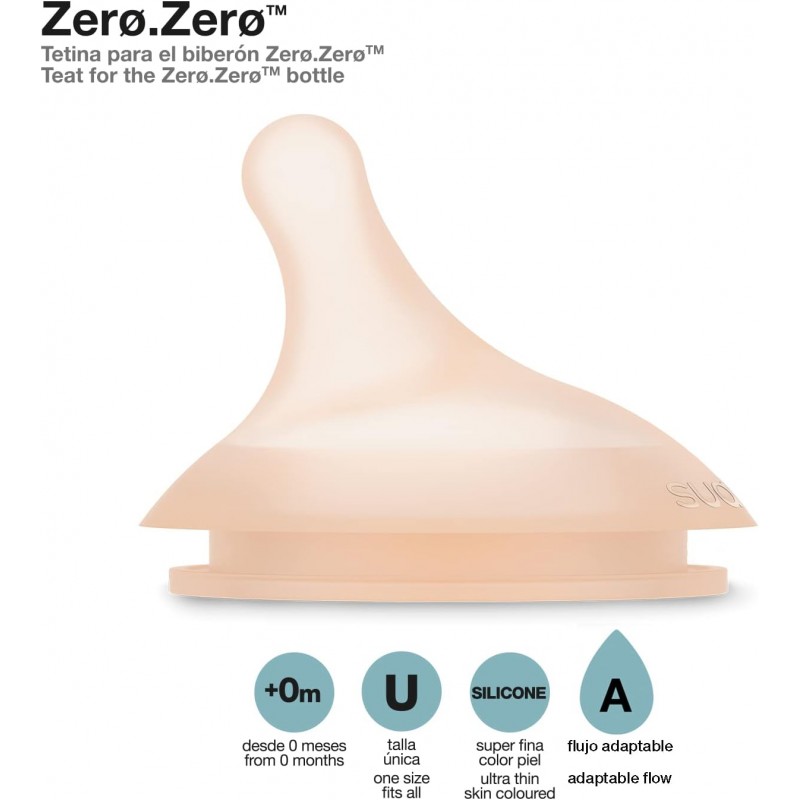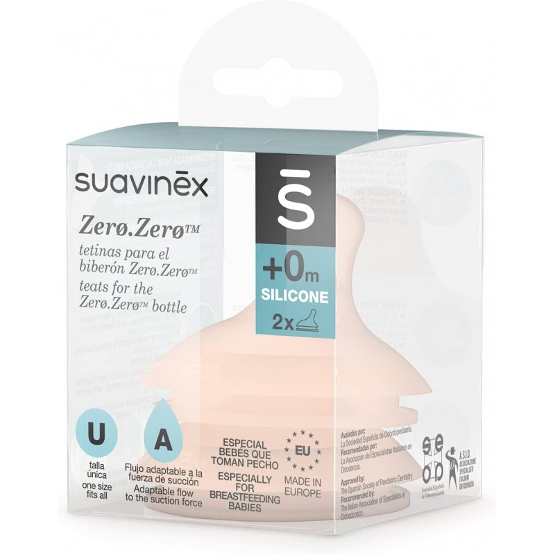 Tetina de silicona Suavinex Zero-Zero Lactancia Mixta, diseñada para imitar el pecho materno y facilitar la combinación de lactancia materna y alimentación con biberón. Incluye 2 tetinas.