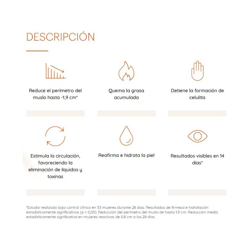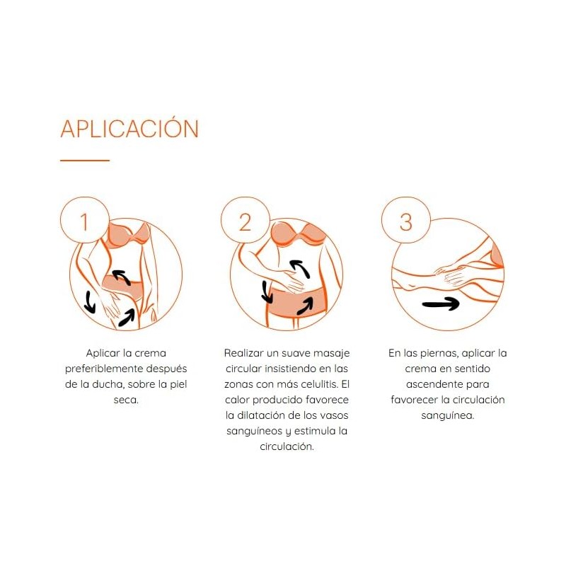 Aplicar realizando masajes suaves y prolongados para mejorar la microcirculación de la zona y aumentar la efectividad de la fórmula. Realizar un suave masaje circular insistiendo en las zonas con más celulitis.