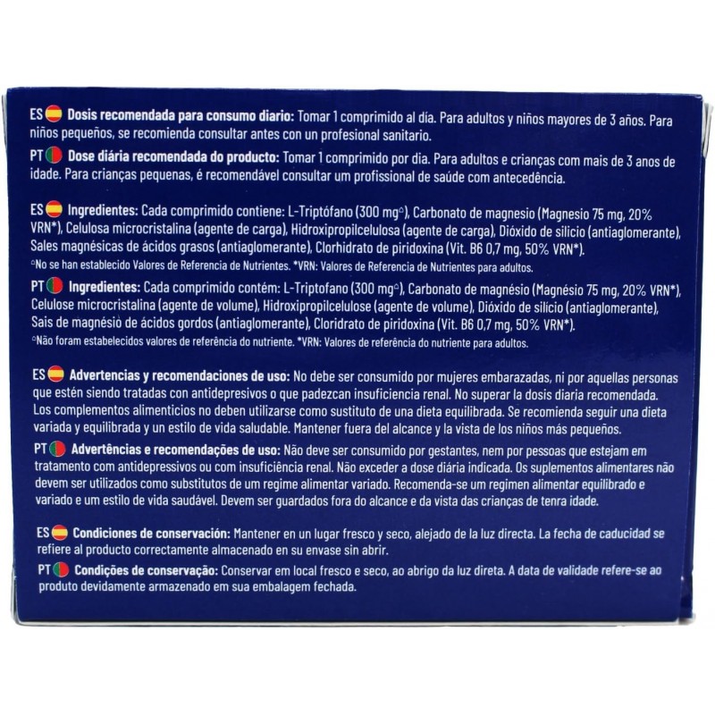 En su fórmula contiene triptófano, magnesio y vitamina b6. Apto para adultos y niños a partir de 3 años. En niños, se recomienda previamente consultarlo con un profesional sanitario.