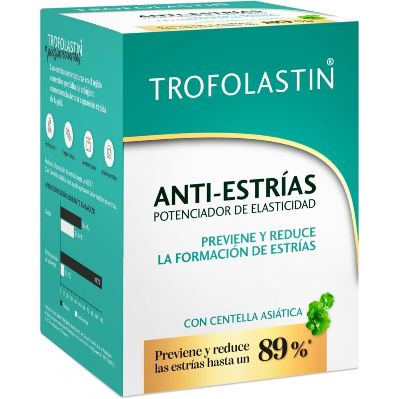 Trofolastin Antiestrías 400 ml es un tratamiento dermatológico diseñado para prevenir y tratar las estrías en la piel. Su fórmula combina ingredientes regeneradores y nutritivos que favorecen la elasticidad cutánea, ayudando a la piel a resistir los cambios de volumen corporal provocados por el embarazo, variaciones de peso o etapas de crecimiento rápido.