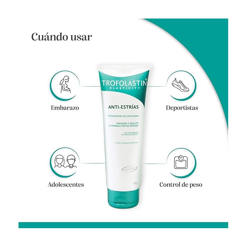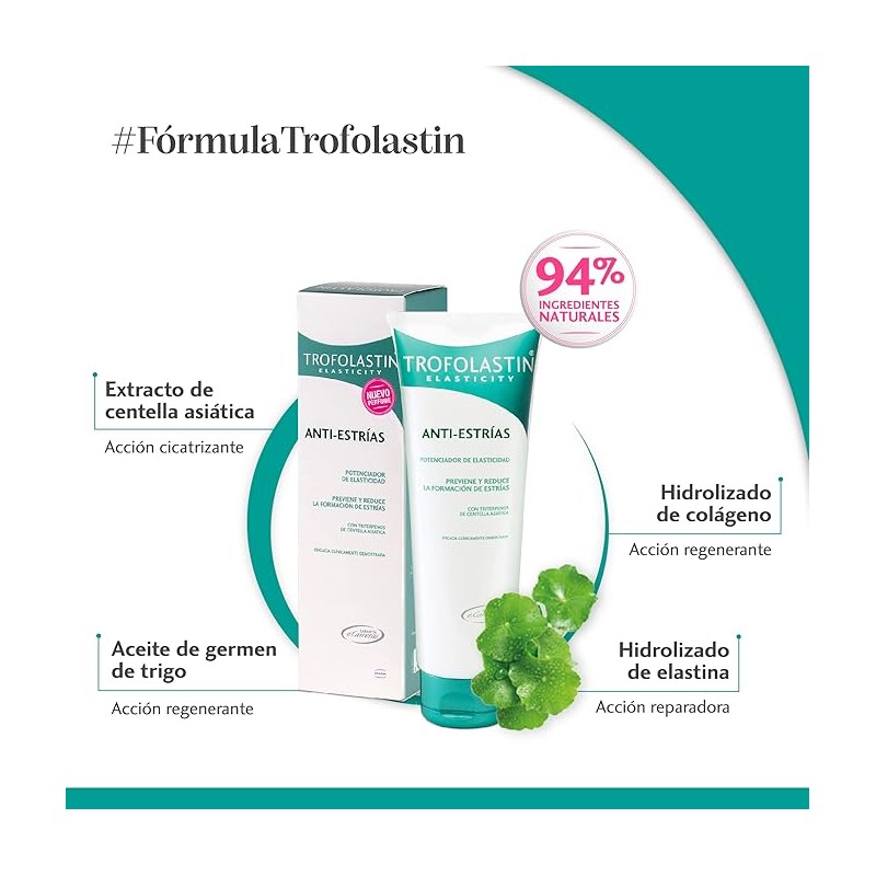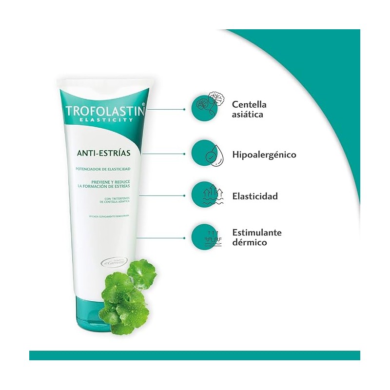 Trofolastin Antiestrías es un tratamiento dermocosmético formulado para prevenir la aparición de estrías y mejorar el aspecto de las ya existentes. Su fórmula contiene centella asiática, un activo regenerador que estimula la producción de colágeno y mejora la resistencia de la piel. También incluye ingredientes hidratantes y reafirmantes que protegen la estructura dérmica frente a la distensión cutánea.