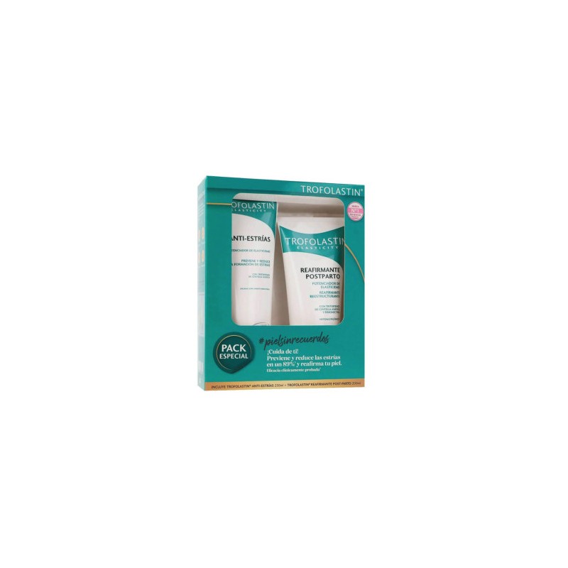 Pack de cuidado intensivo para la piel antes y después del embarazo. Incluye Trofolastin Antiestrías para prevenir y reducir estrías y Trofolastin Post Parto, que ayuda a recuperar la firmeza y elasticidad de la piel tras el parto.
