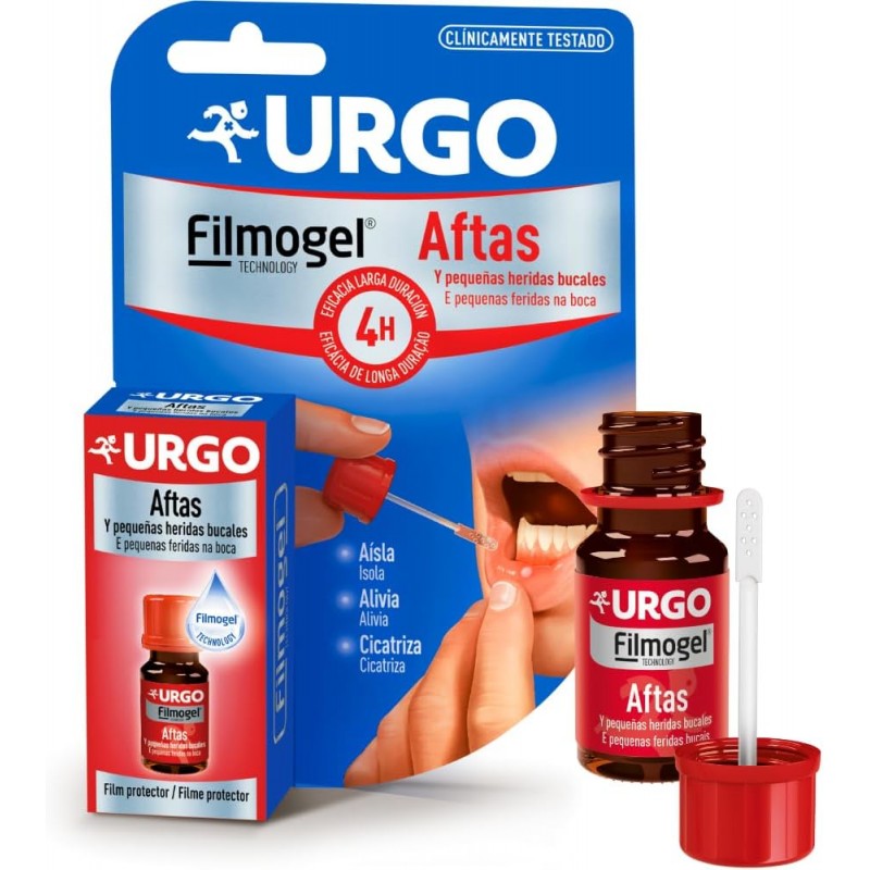 Más informaciónUrgo Aftas es un tratamiento eficaz en formato líquido-gel para el alivio inmediato del dolor y protección de aftas, pequeñas úlceras bucales o lesiones provocadas por ortodoncia o prótesis dentales. Su exclusiva tecnología filmógena crea una película invisible, flexible y resistente al agua sobre la lesión, que actúa como un vendaje líquido. Este recubrimiento protege la zona de agresiones externas (comida, bebidas, saliva), alivia el dolor de forma duradera y acelera el proceso natural de cicatrización. Incluye aplicador de alta precisión para una administración fácil y sin contacto directo con los dedos.