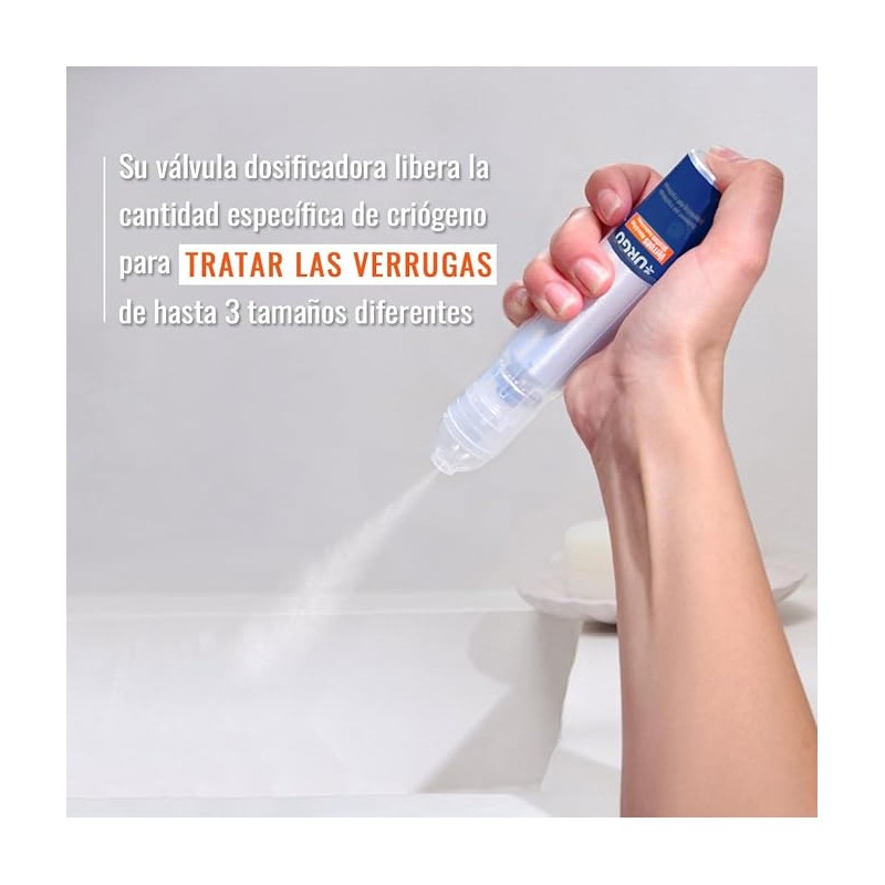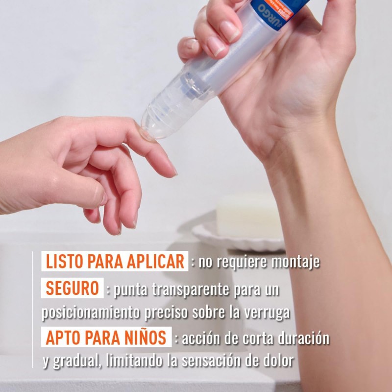 Este producto destaca por su facilidad de uso, ya que viene listo para aplicar sin necesidad de montaje. Además, incorpora una válvula dosificadora inteligente que libera la cantidad exacta de producto según el tamaño de la verruga, permitiendo un tratamiento preciso y seguro.