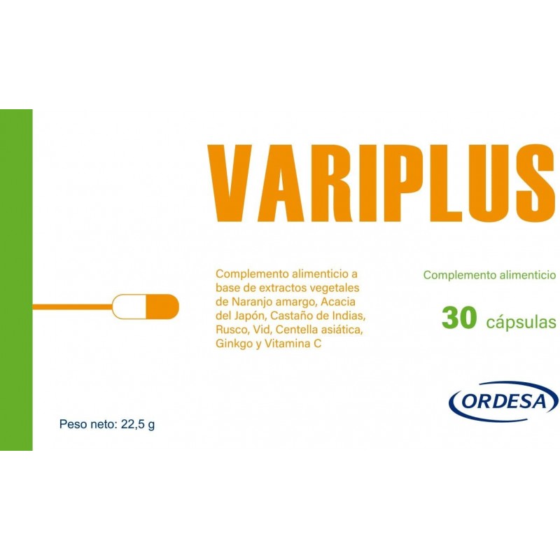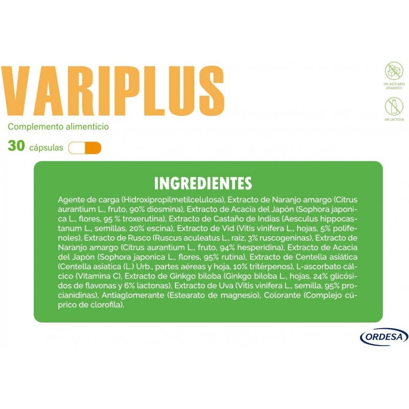 Citrus aurantium L., fruto (extto de naranjo amargo), extacto de Sófora (Sophora japonica L., grano), extracto de castaño de indias (Aesculus hippocastanum L., hoja), extracto de rusco (Ruscus aculeatus L., rizoma), extracto de vid (Vitis vinifera L., hoja), extacto de Sófora (Sophora japonica L., flor), extracto de Centella asiatica (Centella asiatica (L.) urb, partes aéreas, extracto de Ginkgo (Ginkgo Biloba L., hoja), L-ascorbato cálcico (Vitamina C), extracto de vid (Vitis vinifera L., grano), antiaglomerante (estearato de magnesio (E470b).