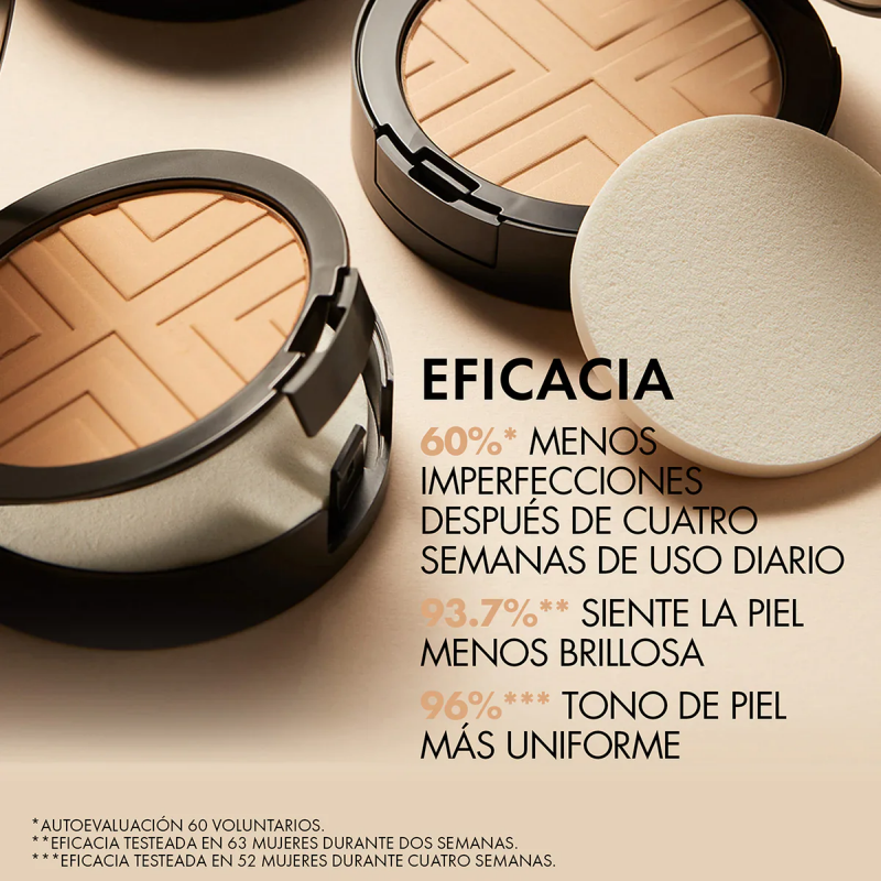 Polvo compacto de alta cobertura que uniforma el tono, matifica la piel y controla brillos, proporcionando un acabado natural y duradero