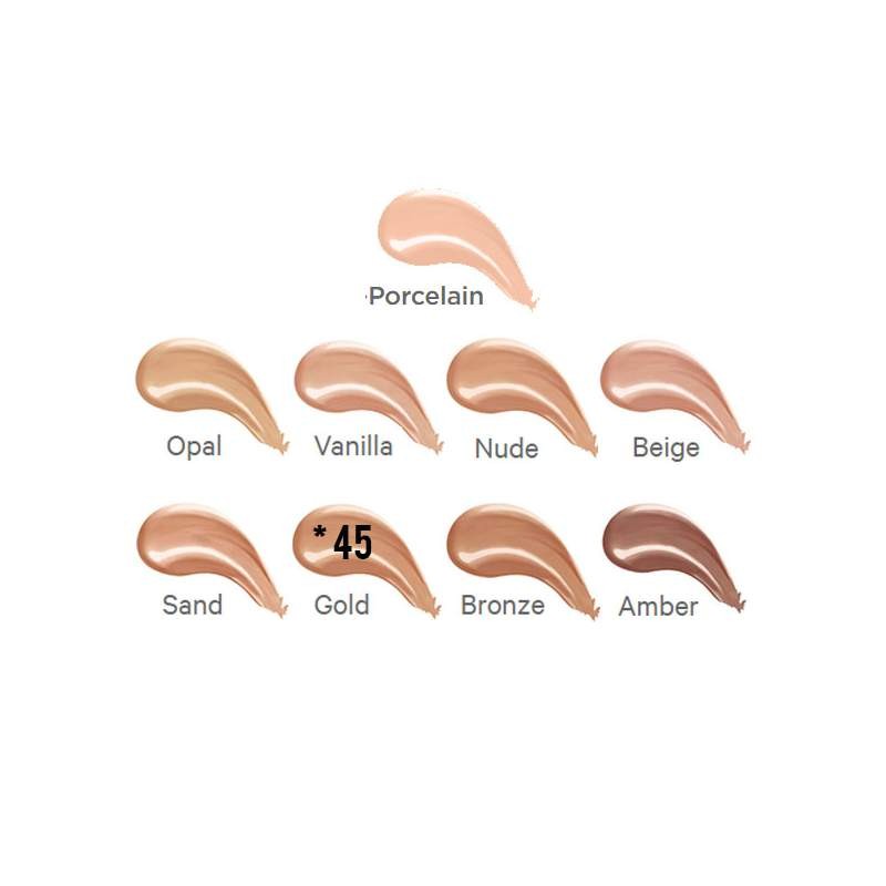 Fondo de maquillaje corrector de alta cobertura y tono dorado, que unifica, disimula imperfecciones y realza la luminosidad natural de pieles medias a oscuras.