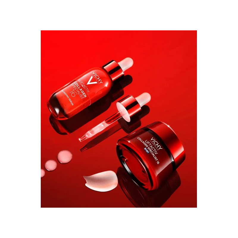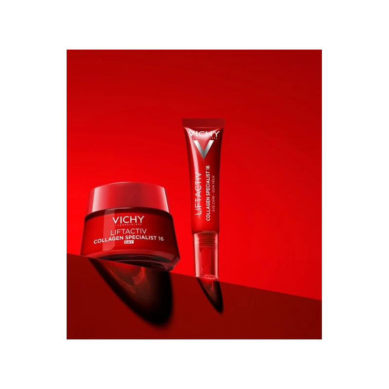 Vichy Liftactiv Collagen Specialist 16 Contorno de Ojos 15 ml ha sido desarrollado para combatir los signos de envejecimiento en la delicada zona del contorno ocular, actuando sobre las arrugas, la flacidez y las líneas de expresión. Su fórmula avanzada combina péptidos pro-colágeno que estimulan la producción natural de colágeno, contribuyendo a mejorar la firmeza y elasticidad de la piel.