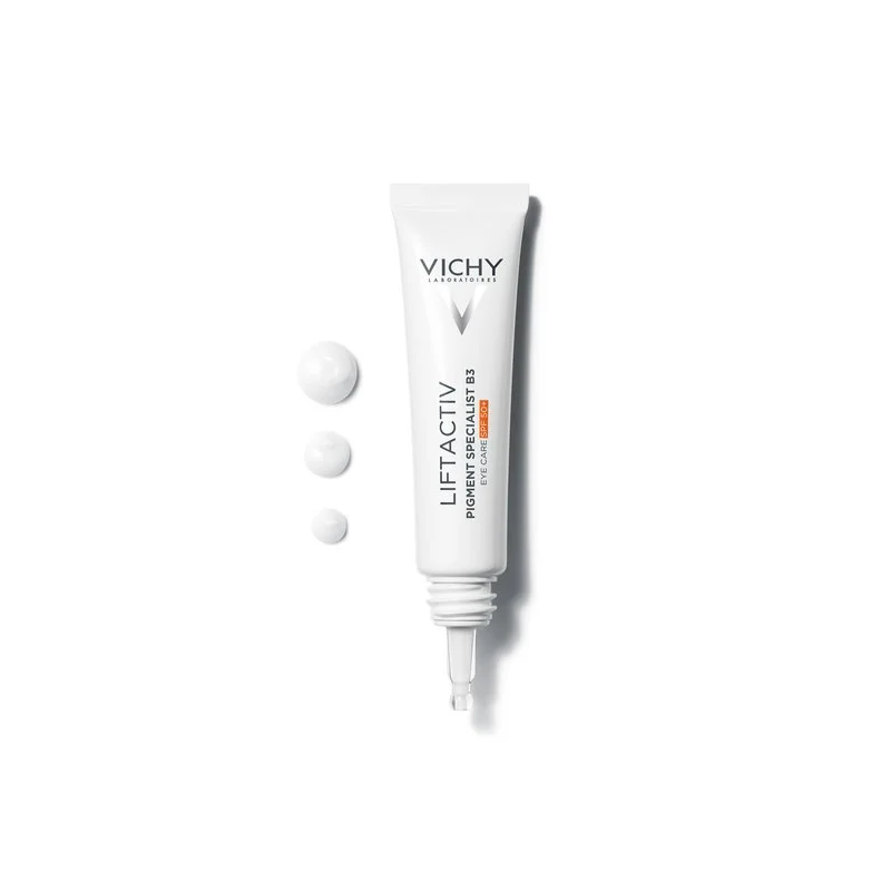Liftactiv B3 Contorno Ojos SPF50+ de Vichy está especialmente formulado para actuar sobre las manchas pigmentarias del contorno ocular, incluyendo las ojeras marrones, causadas por la exposición solar, la edad o factores hormonales. Enriquecido con Niacinamida (B3), Cafeína y Vitamina CG, corrige visiblemente las manchas oscuras, reduce las ojeras pigmentadas y aporta una mirada más clara y uniforme.
