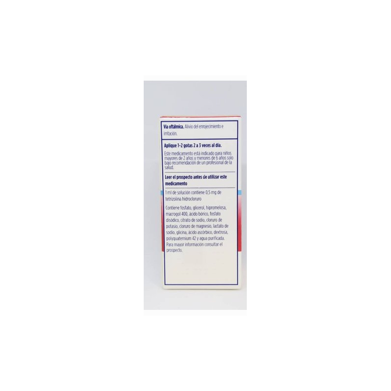 Este colirio es especialmente eficaz frente a irritaciones debidas a factores ambientales como humo, polvo, viento, agua clorada, luz intensa o alergias. Gracias a su acción descongestionante, reduce la congestión ocular, el picor y el lagrimeo, proporcionando una sensación de alivio y frescor.