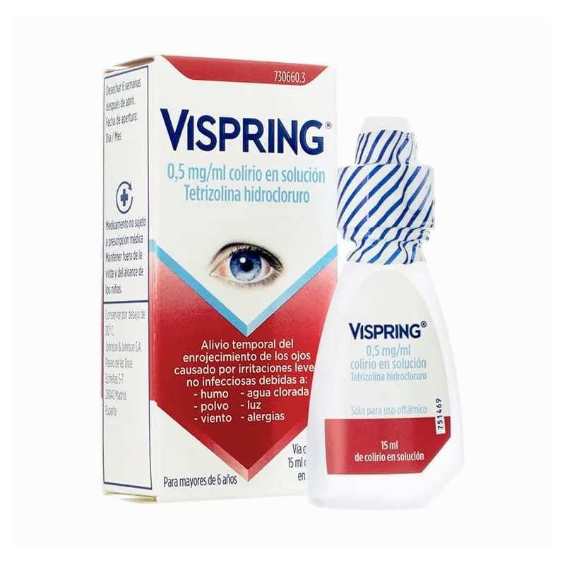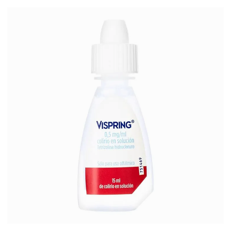 VISPRING 0,5 mg/ml es un colirio en solución oftálmica que contiene tetrizolina hidrocloruro como principio activo, indicado para aliviar temporalmente el enrojecimiento de los ojos causado por irritaciones leves no infecciosas.