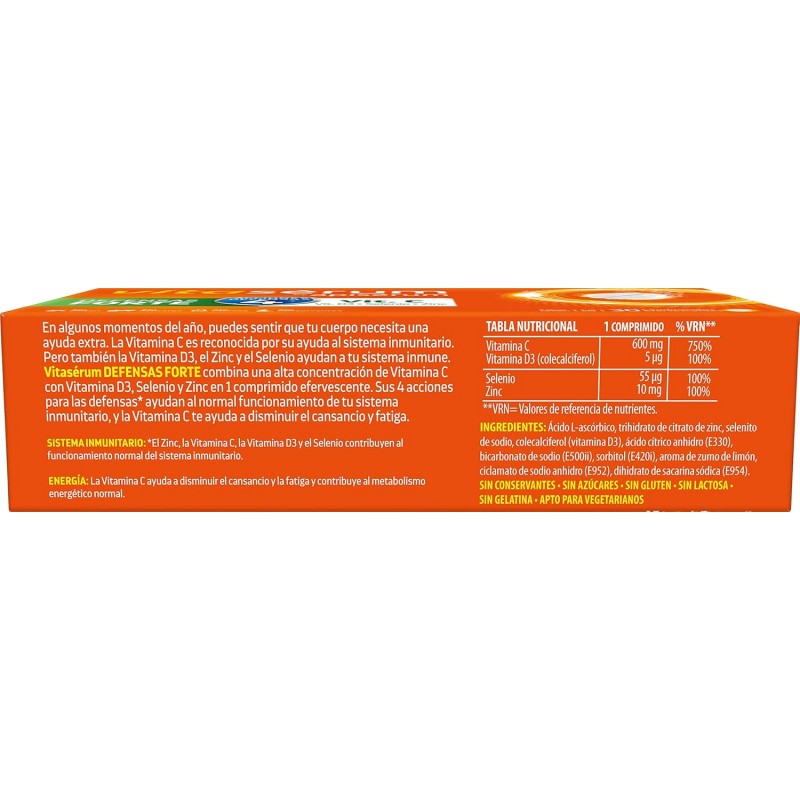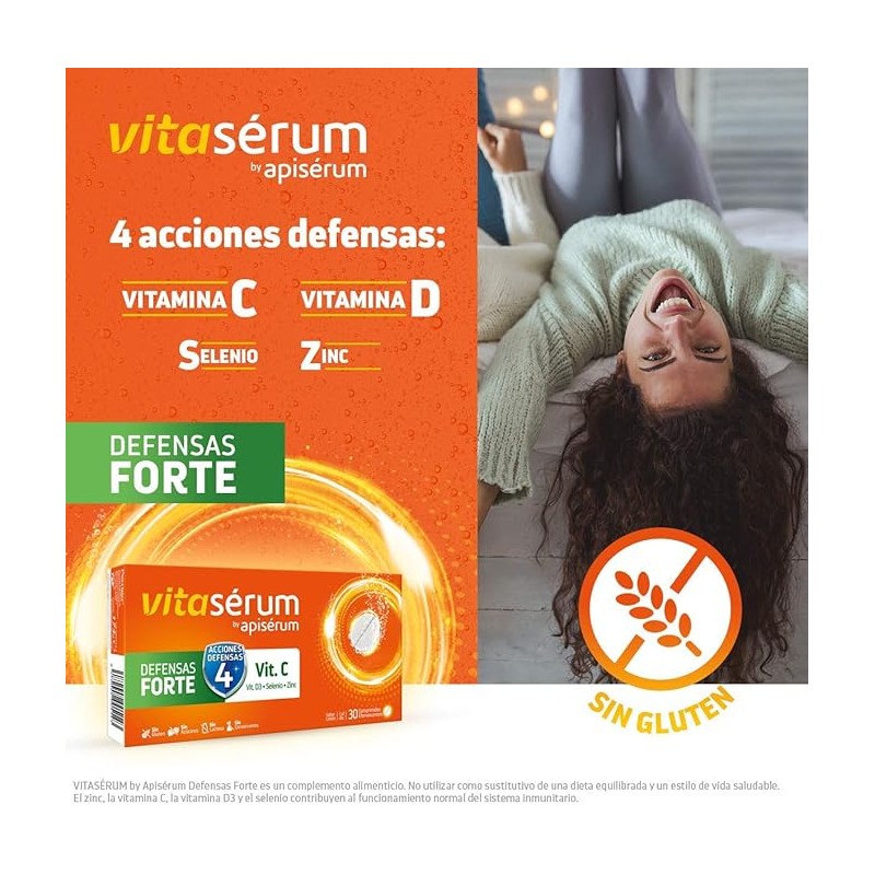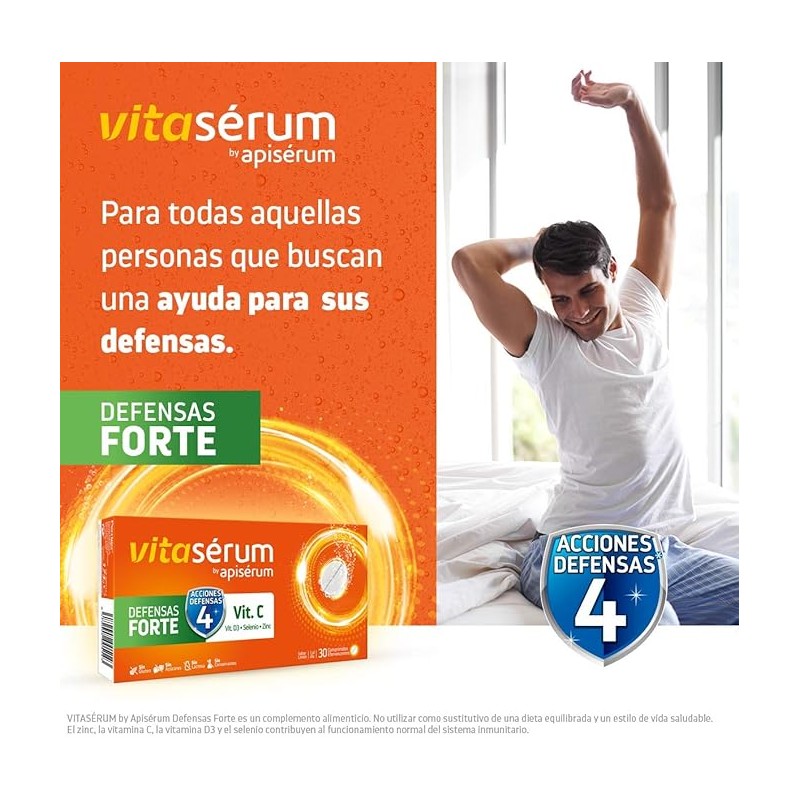 Vitaserum de Apiserum Defensas Forte 30 Comprimidos Efervescentes es un suplemento ideal para reforzar las defensas del organismo. Este producto combina vitamina C, zinc y otros nutrientes esenciales que favorecen la respuesta inmune, contribuyendo a proteger el cuerpo frente a agentes externos en épocas de mayor exposición a resfriados y gripes. La vitamina C un ingrediente natural conocido por sus múltiples beneficios para la salud, aporta energía y vitalidad y junto con el zinc trabajan para reforzar el sistema inmunológico y mejorar la resistencia natural del organismo. Además contiene Selenio y vitamina D3.