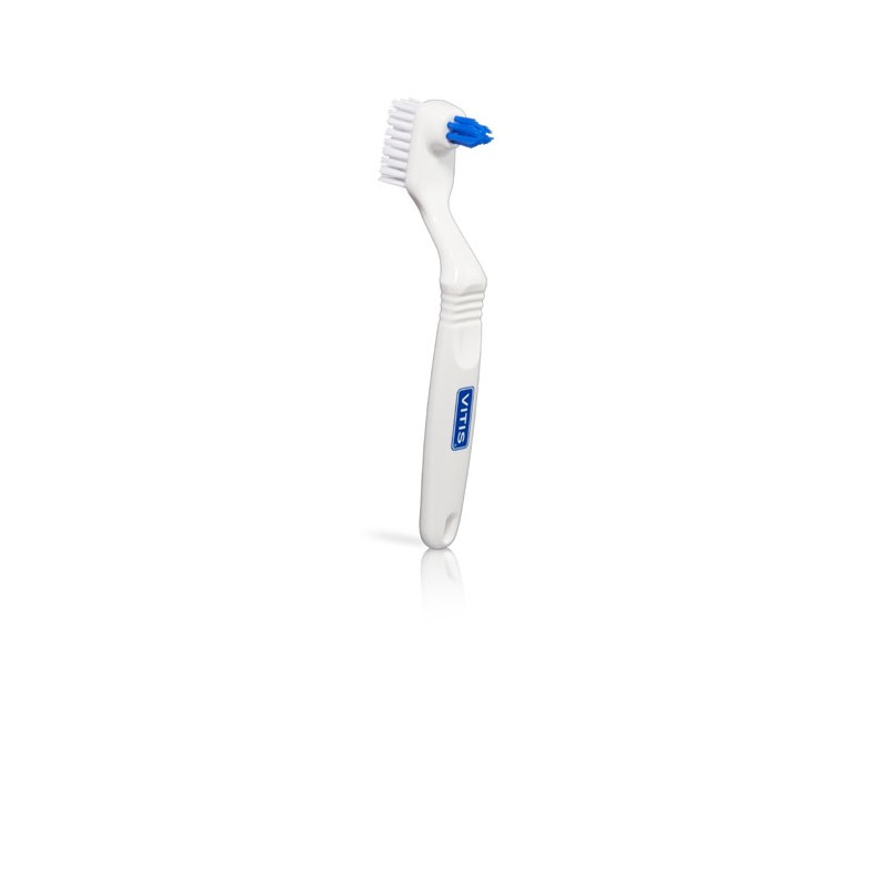 El cepillo dental VITIS para prótesis dentales incluye dos cabezales especialmente diseñados para una limpieza eficaz y suave de las prótesis, garantizando una higiene bucal completa y confortable.