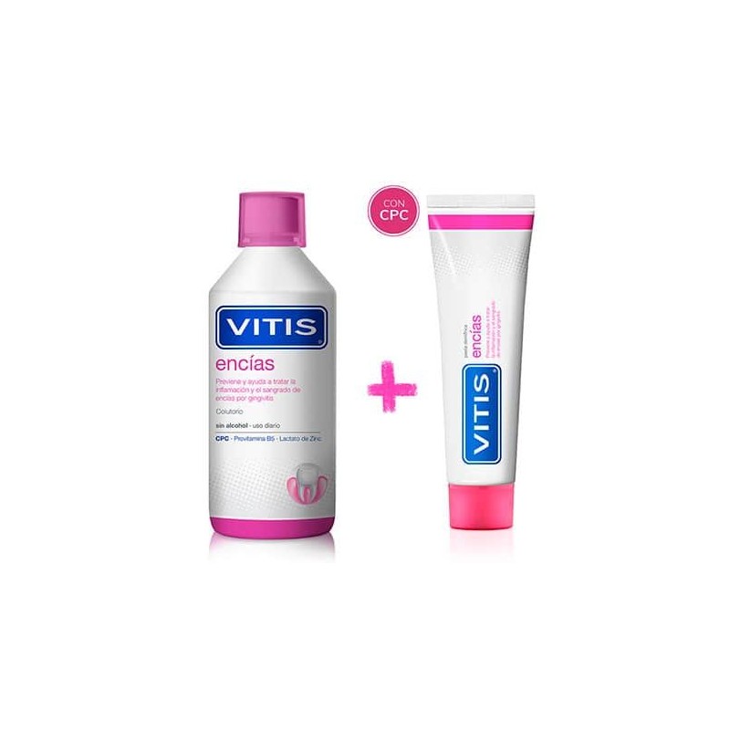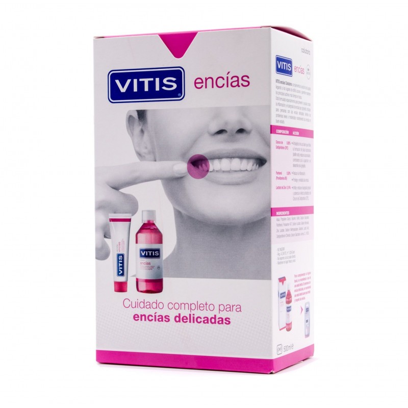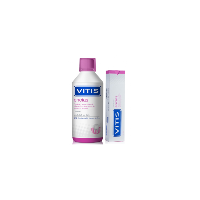 El pack VITIS Encías incluye una pasta dentífrica y un colutorio diseñados para el cuidado diario de las encías sensibles. Su fórmula ayuda a reducir la inflamación, fortalecer las encías y prevenir el sangrado, proporcionando una higiene bucal completa y una sensación de frescor duradero.