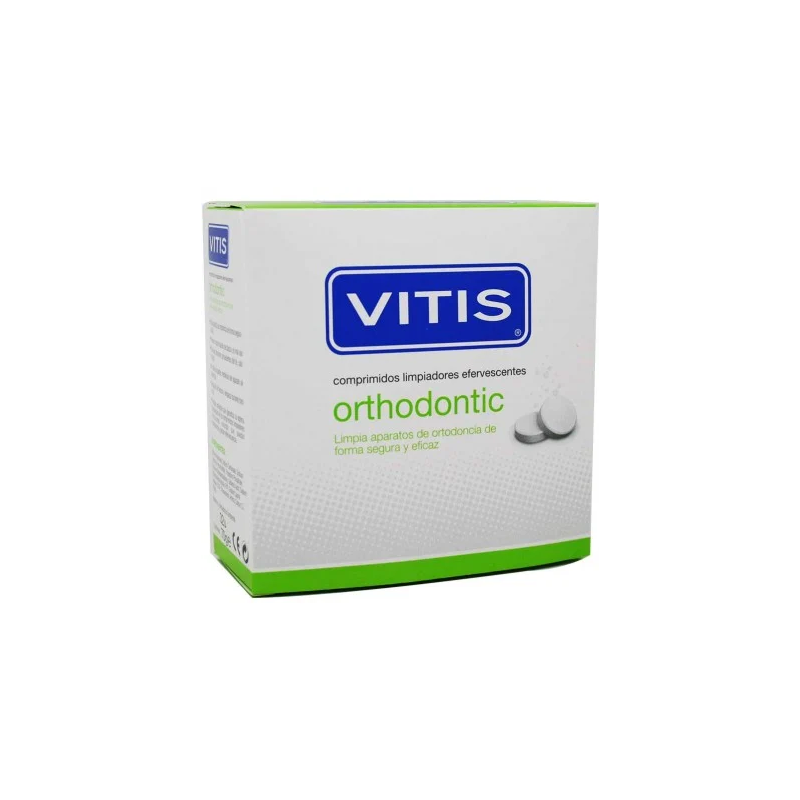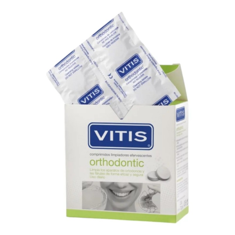 VITIS Orthodontic 32 comprimidos efervescentes para limpieza de prótesis y aparatos de ortodoncia, eliminan eficazmente placa y restos, dejando una sensación de frescura y limpieza profunda.