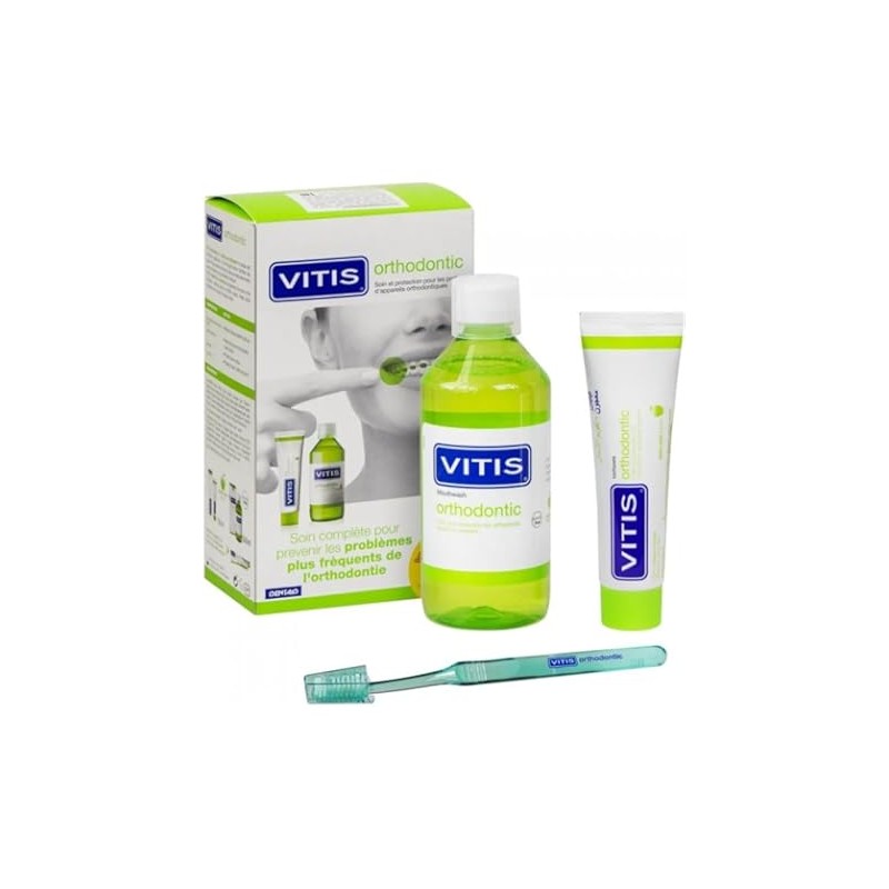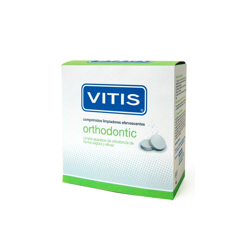 VITIS Orthodontic comprimidos efervescentes están formulados para la limpieza y desinfección de prótesis dentales y aparatos de ortodoncia, facilitando la eliminación de restos de comida, placa bacteriana y otros depósitos. Su acción efervescente penetra en todas las superficies, incluyendo zonas difíciles de alcanzar, manteniendo la higiene y frescura que requieren estos dispositivos. Además, ayuda a prevenir la acumulación de bacterias y malos olores, contribuyendo a una boca más saludable y un uso más cómodo de las prótesis o aparatos.