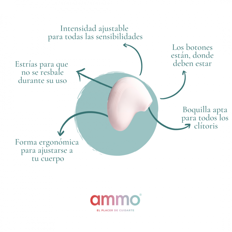 Dispositivo estimulador externo de clítoris por ondas sónicas. Contiene 17 patrones de estimulación con varios ritmos e intensidades, cada uno con un porqué.