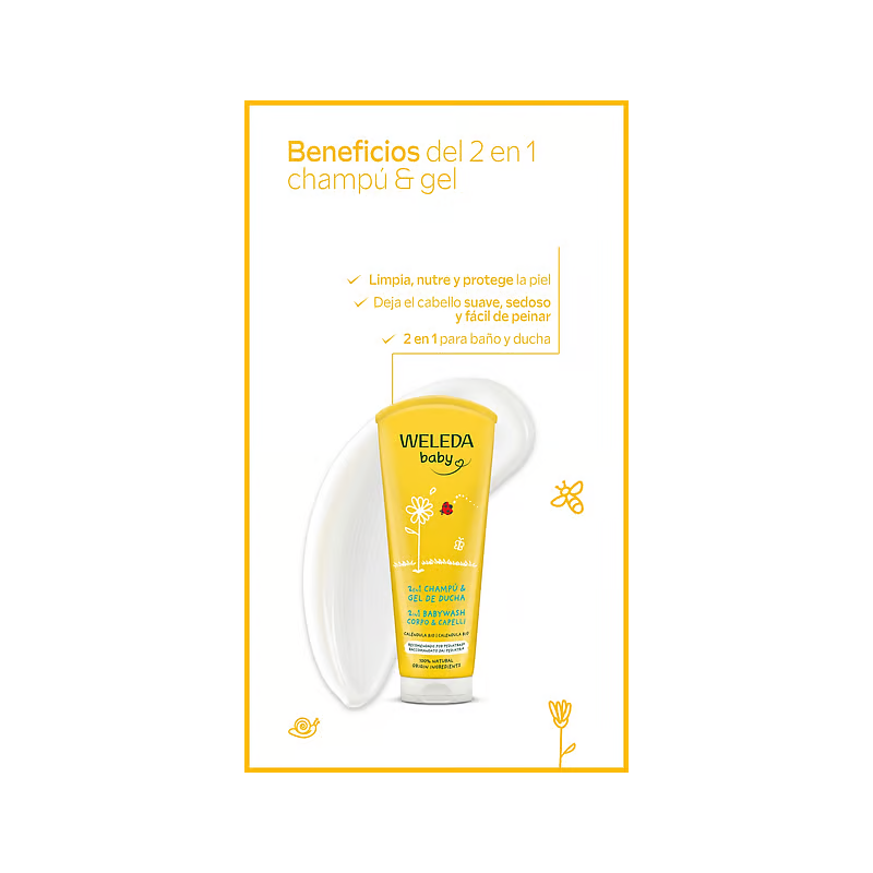 Diseñado especialmente para la higiene diaria de los más pequeños, Weleda Champú y Gel de Ducha de Caléndula limpia delicadamente el cuerpo y el cabello del bebé sin resecar. Su fórmula sin jabón ni sulfatos contiene extracto de caléndula orgánica, conocida por sus propiedades calmantes y antiinflamatorias, que ayuda a prevenir la irritación cutánea.