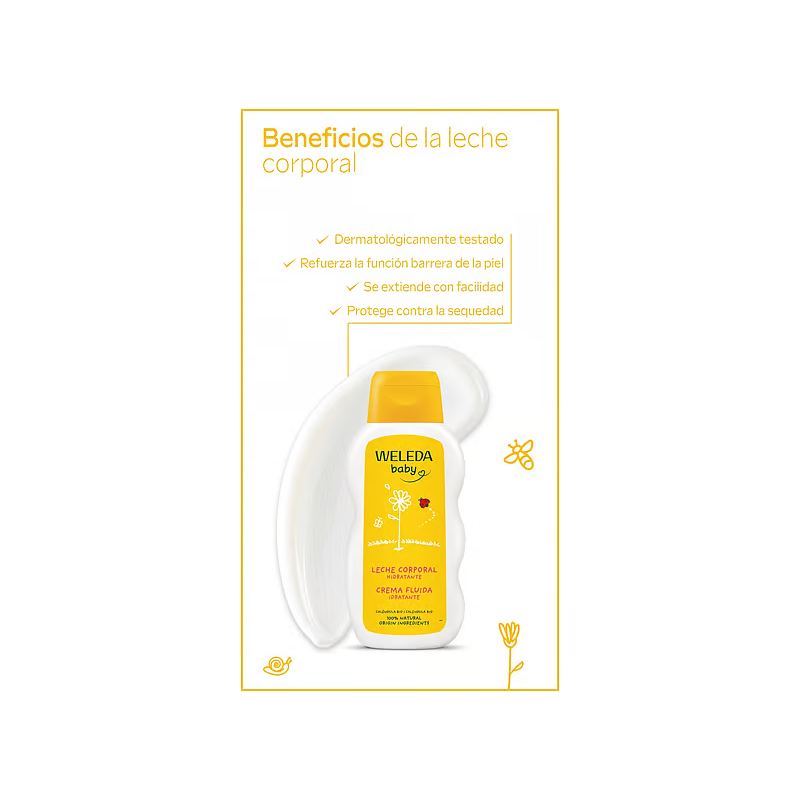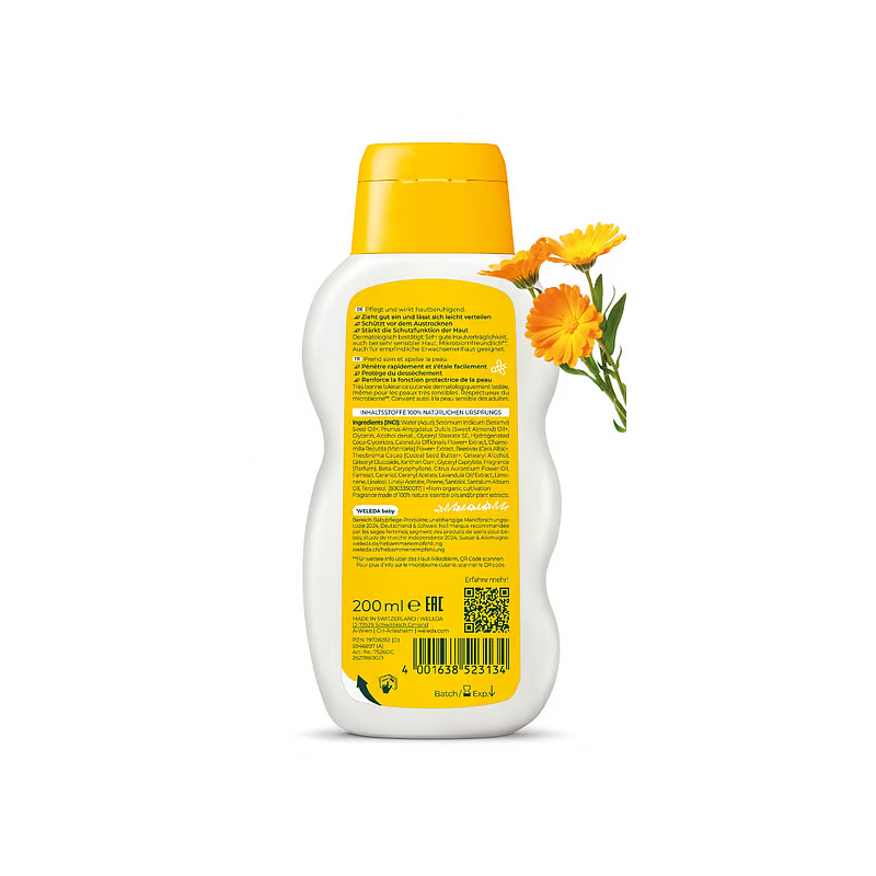Suave leche para el cuidado de la piel a base de ingredientes naturales y extracto de caléndula. Hidrata y suaviza y favorece las funciones naturales de la piel del bebé. Penetra fácilmente sin dejar una película grasa. Leche fluida de absorción rápida que nutre, suaviza y calma la piel tras el baño, dejándola suave y perfectamente calmada.