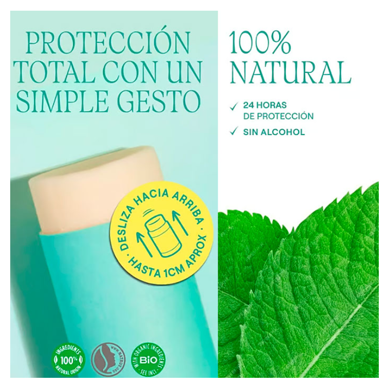Desodorante natural en stick que neutraliza el mal olor y refresca la piel, con fórmula sin alcohol y un aroma revitalizante a eucalipto y menta.