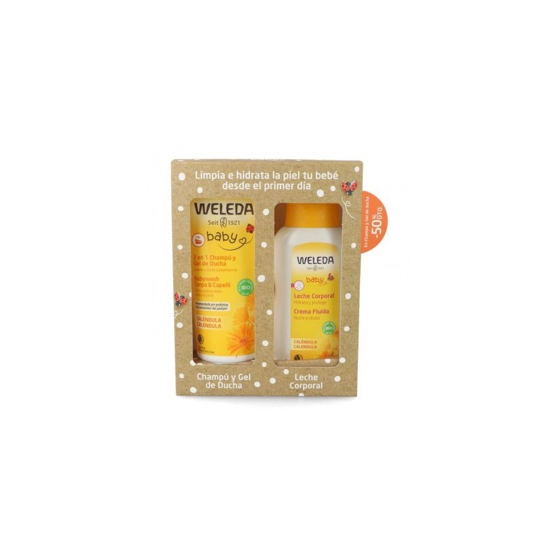 Pack de Weleda que contiene Gel-champú y leche corporal de Caléndula.