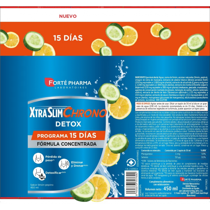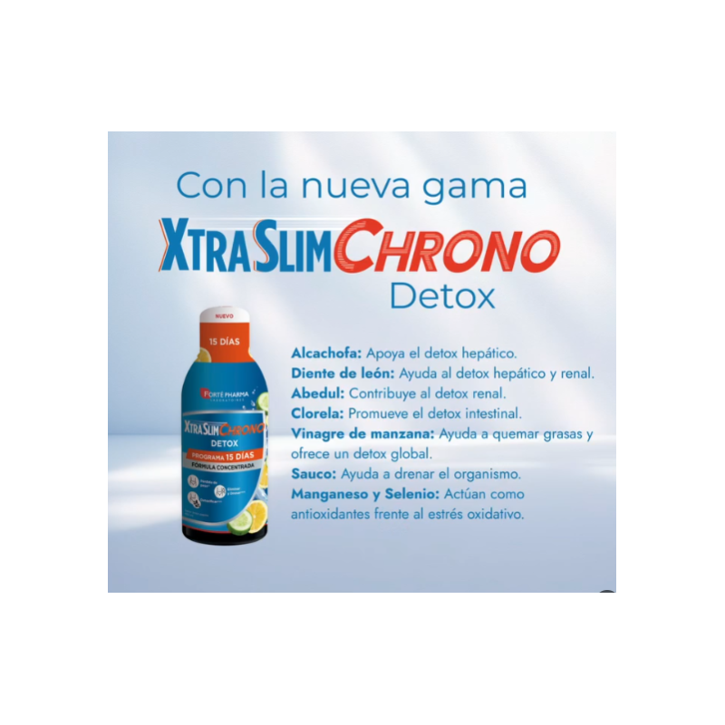 Xtra Slim Chrono Detox es un innovador complemento alimenticio en formato líquido que contribuye a la detoxificación del organismo, apoyando las funciones hepáticas y renales. Su combinación de ingredientes naturales ayuda a eliminar toxinas acumuladas, reducir la hinchazón y mejorar la digestión.