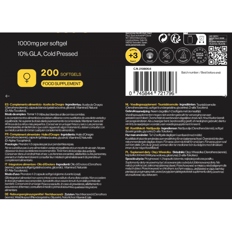 El Zenement Aceite de Onagra es un complemento alimenticio elaborado a partir de aceite de semillas de onagra, presentado en cómodas cápsulas blandas para facilitar su consumo diario, con el objetivo de controlar los síntomas del síndrome Premenstrual y la menopausia. Ayuda a reducir inflamaciones cutáneas, mejora la salud de la piel y el cabello y tiene propiedades antiinflamatorias y antioxidantes, aportando también así beneficios a la salud cardiovascular y articular de la mujer.