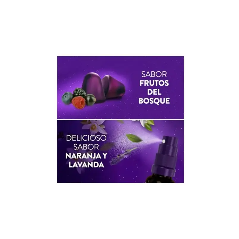 Duerme mejor con gummies y spray de melatonina, sabor frutas del bosque.